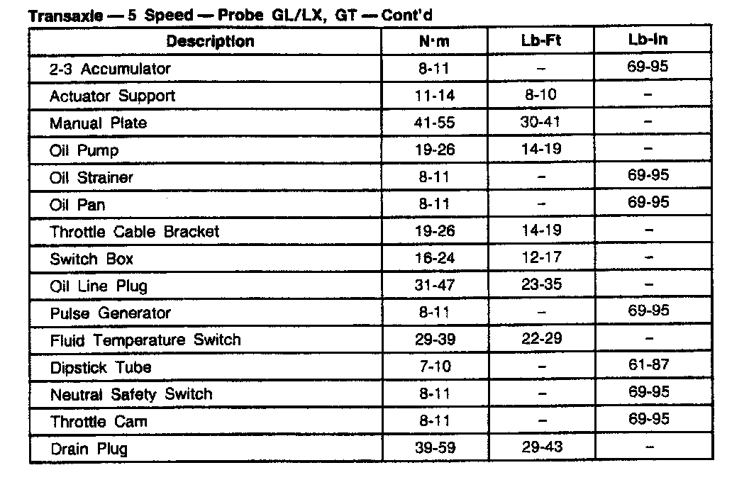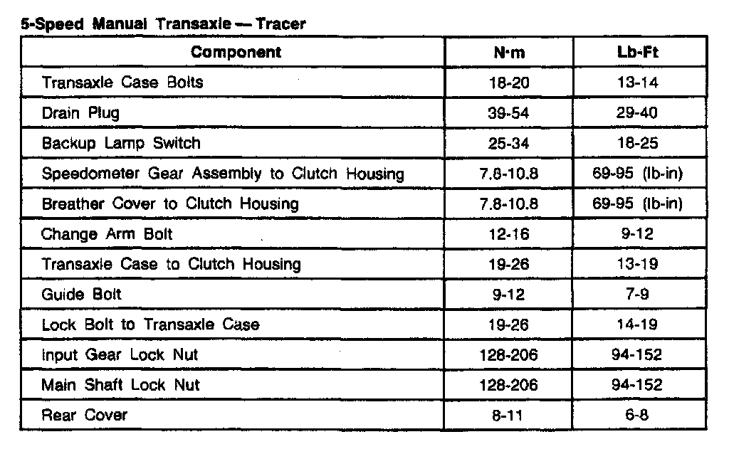 MTX (A) 5-spd M/T, Clutch Torque (Escort/Tracer):