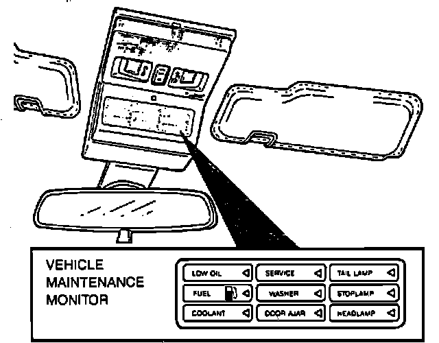 On models with Vehicle Maintenance Monitor, at 7,500 mile intervals a Service lamp, located on the overhead map lamp console, will be illuminated for 3 minutes after engine start, Fig. 9. After performing the required interval service, reset the service interval. On models with speed alarm keypad, depress and hold the Service reset button, until three tones have sounded. On models less speed alarm keypad, locate reset hole in overhead console, then using a suitable tool depress the reset button located behind the hole.