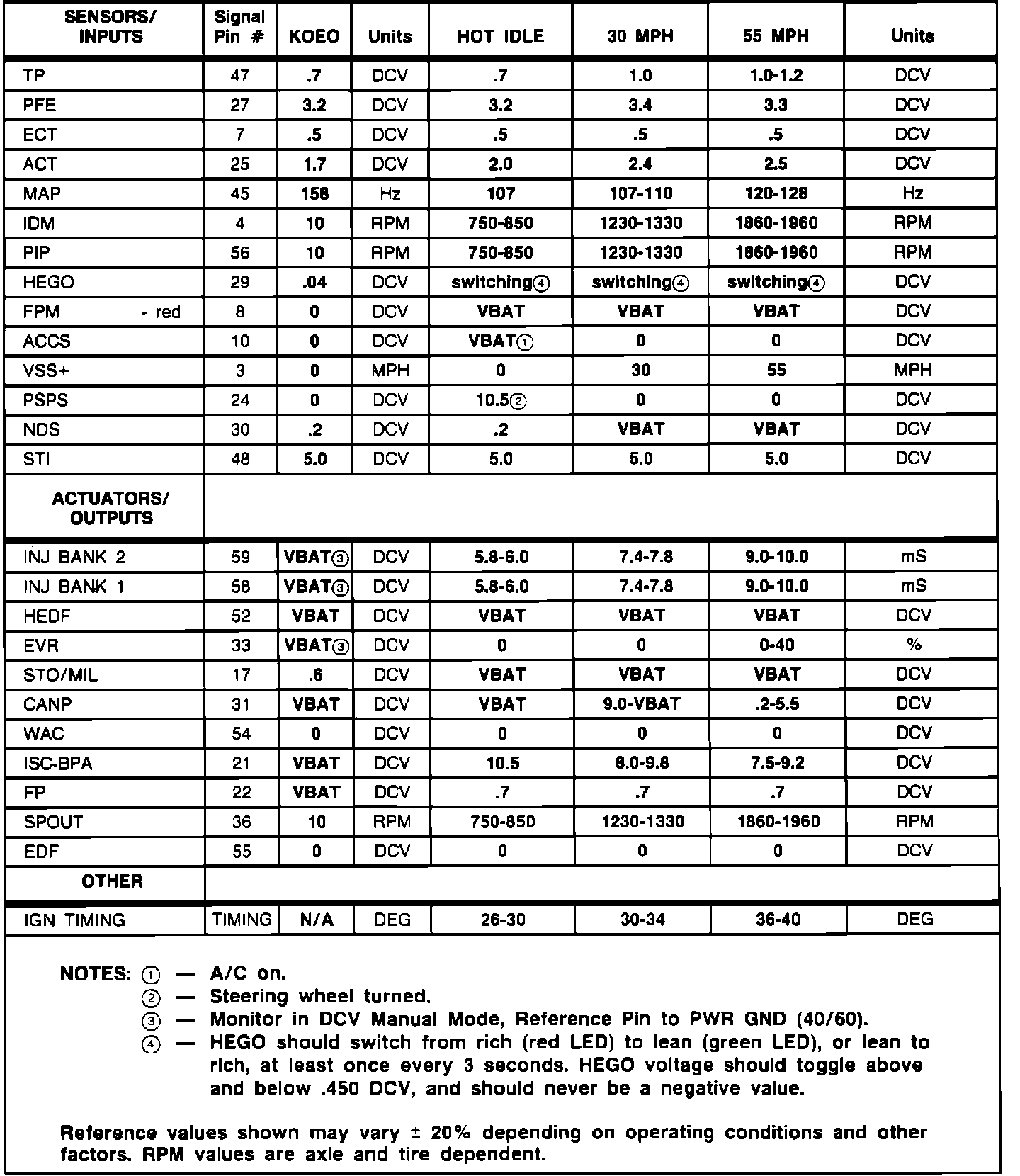 5. Reference values shown in the charts may differ between vehicles due to component tolerances, driving conditions, weather, etc. These values were recorded at approximately 600 feet above sea level and ambient temperatures ranging from 50 to 70 degrees Fahrenheit. Some EEC-IV devices are temperature dependent and their values may vary greatly. Other values are calibration dependent and may also vary.