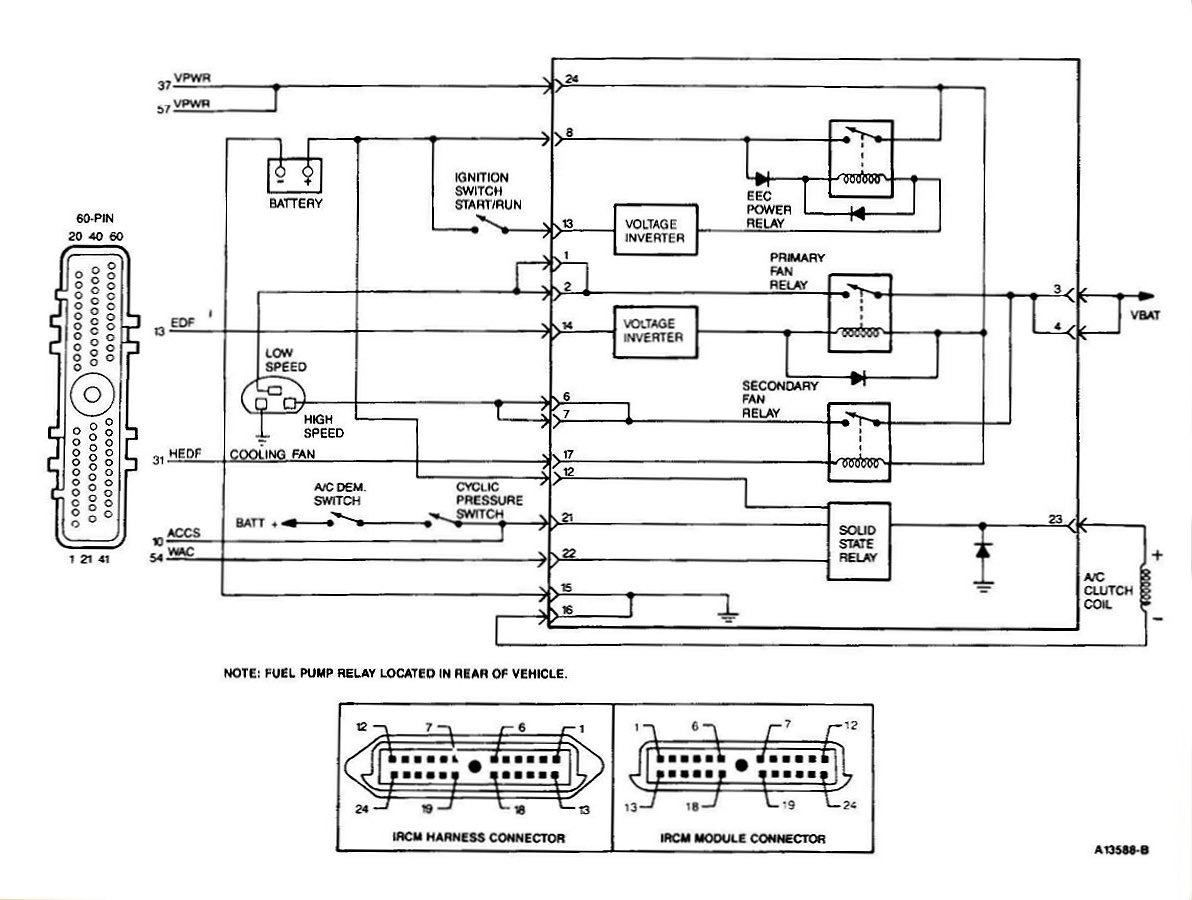 The Integral Relay Control Module (IRCM) interfaces with the EEC-IV processor to provide control of the cooling fan, A/C clutch, and the fuel pump.