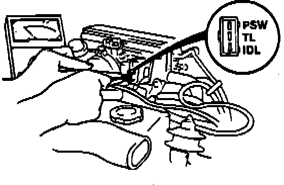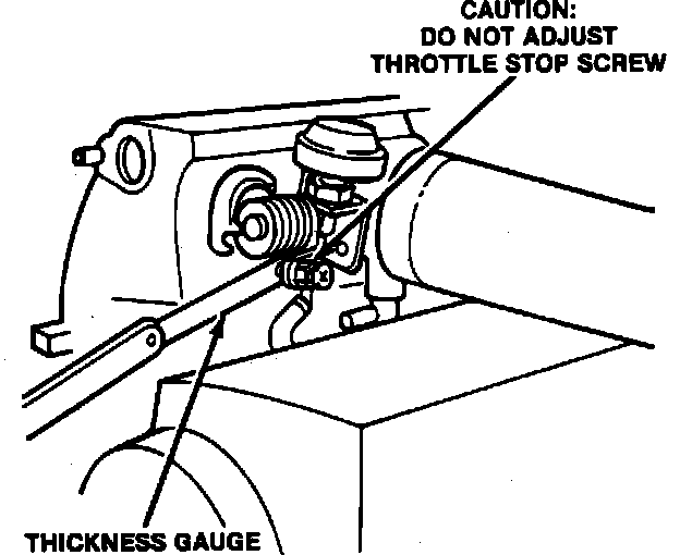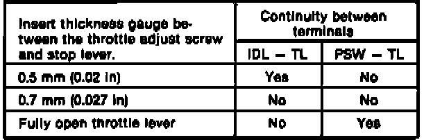 3. Insert appropriate thickness gauge between throttle and adjustment screw. Check for continuity between terminals. Use the following chart to determine the need for adjustment.