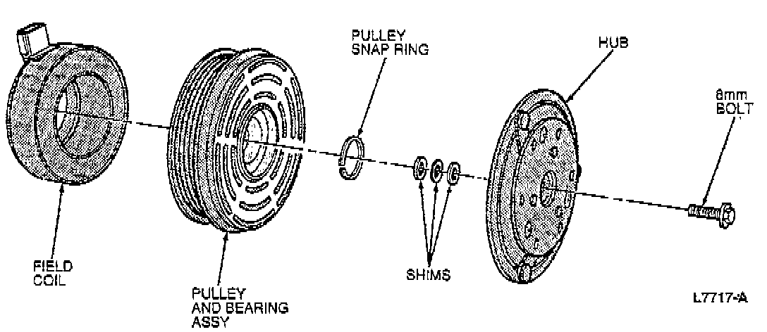 7. If the clutch air gap is not within 0.45-0.85 mm (0.018-0.033 inch), repeat Steps 4, 5, and 6 with various thickness shims until the air gap is within specified limits.