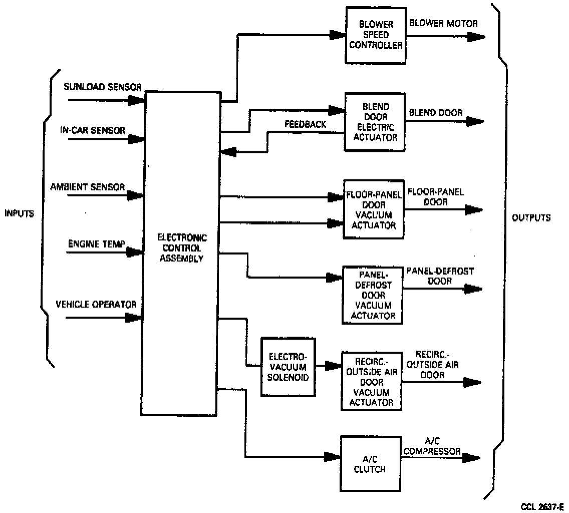 A small DC electric motor or actuator is used to operate the temperature blend door. Vacuum actuators are used to control each of the three remaining air distribution doors. A feedback circuit is used in the blend door actuator to supply the control assembly with blend door position information. The blower motor is controlled by the control assembly through the blower speed controller. The blower speed controller is necessary to react to the low power signal from the control assembly to provide high power signal required to drive the blower. The System Response Chart shows the control assembly response to the function selections.