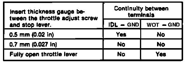 3. Insert appropriate thickness gauge between throttle and adjustment screw. Check for continuity between terminals. Use the following chart to determine the need for adjustment.