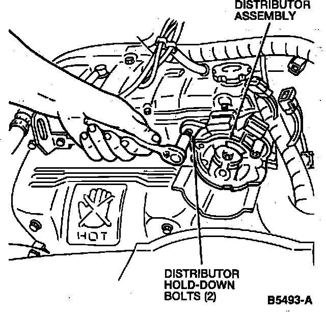 5. Remove distributor hold-down bolts; lift distributor from engine.