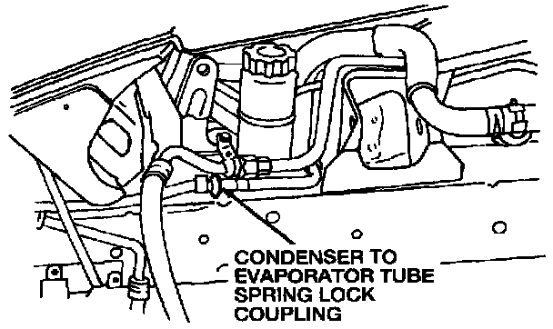 2. Use an appropriate spring lock coupling disconnect tool to disconnect the condenser to evaporator spring lock coupling from the A/C evaporator core outlet hardline (near the bulkhead).