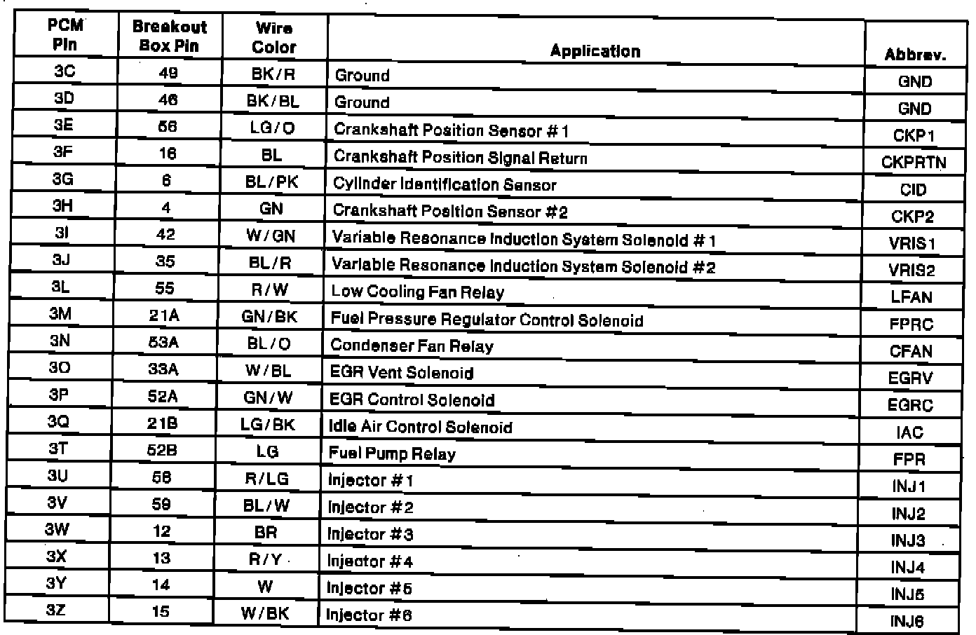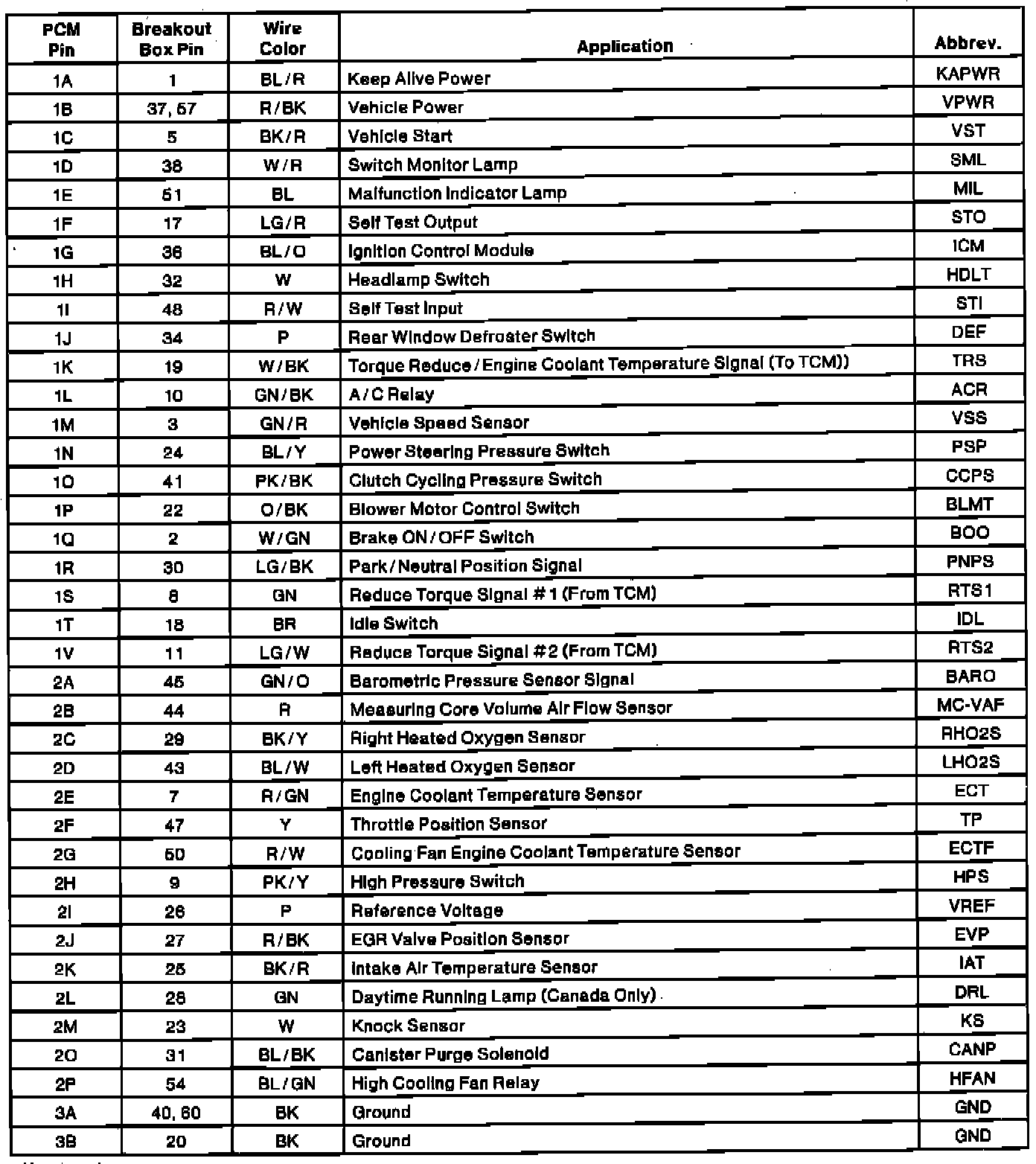 PCM Connector Pin Chart (Part 1, A/T):