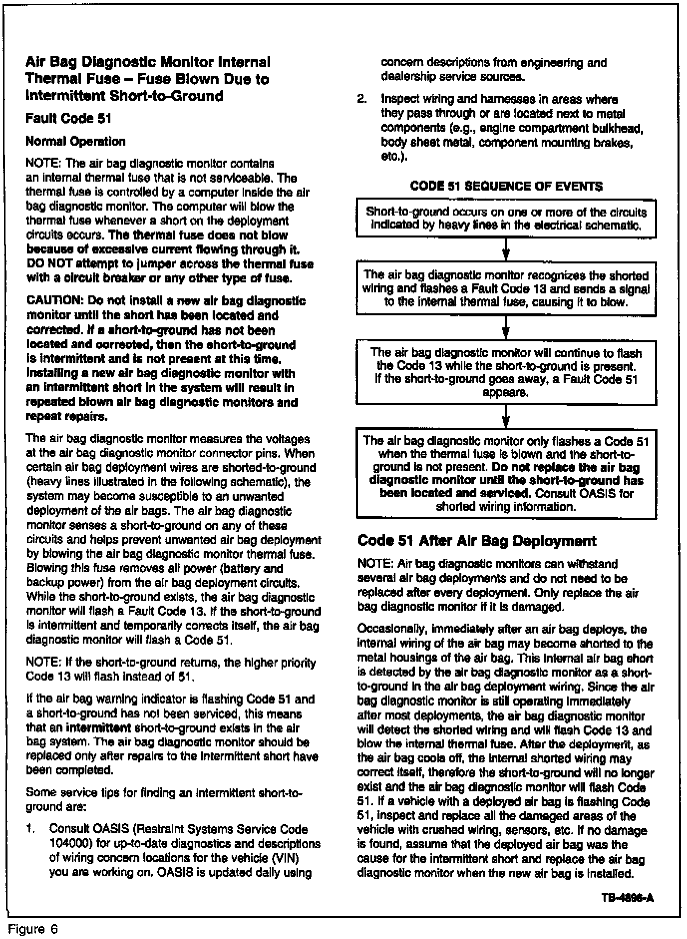 If the air bag indicator is flashing Code 51 and a short-to-ground has not been serviced, this means an intermittent short-to-ground exists in the air bag system. The diagnostic monitor should only be replaced after service of the short-to-ground has been completed.