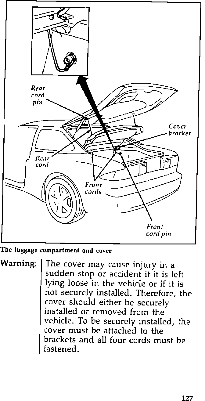 The Owner Guide furnished with some 1993 Probe cars does not describe the proper method for reattaching the car's luggage compartment cover after removal. If the cover is not properly retained, it would be free to move and could cause injury to rear seat passengers during a sudden stop or accident.