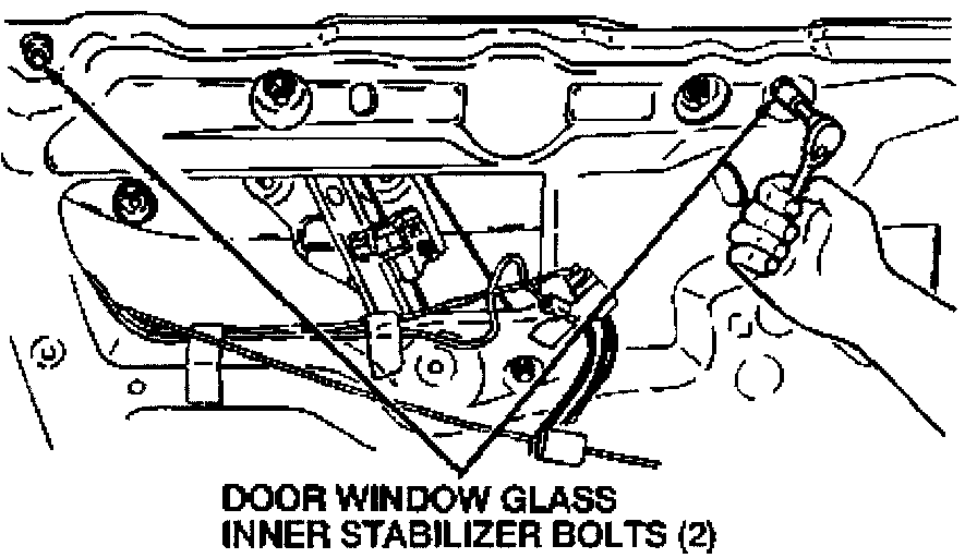e. Remove the two door window glass inner stabilizer bolts and remove the door window glass inner stabilizers.