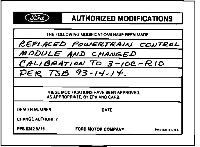 On Taurus SHO vehicles built before 5/17/93, with PCM calibration 3-10C-R00A, replace the Powertrain Control Module with service PCM (F3DZ-12A650-JC) and change the calibration to 3-10C-R10.