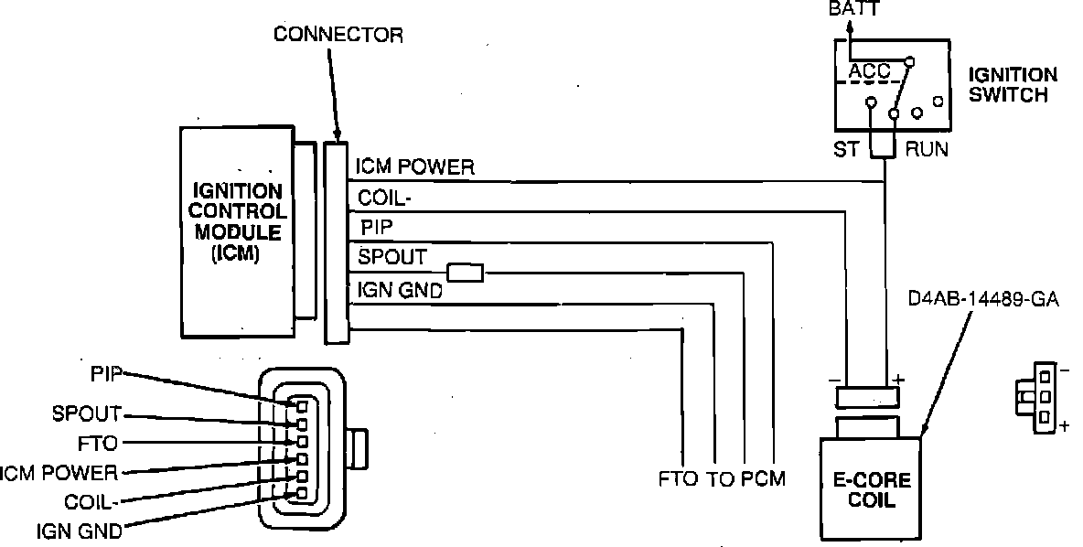 The distributor houses a Hall effect vane switch assembly that sends crankshaft position information to the Ignition Control Module (ICM) where it's Computer Controlled Dwell (CCD) section sets ignition dwell. The signal is then used by the PCM for crankshaft position sensing and the computation of the desired spark advance based on engine demand and calibration. The conditioned spark advance and voltage distribution is accomplished through a conventional rotor, cap and ignition wires.