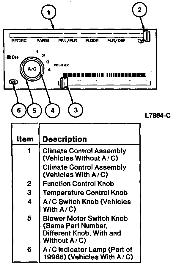 Vehicles equipped with A/C have a dual function blower motor switch equipped with both a rotary knob to control the blower motor and a push knob to control the A/C switch. The climate control assembly also contains the lamp for the A/C indicator.
