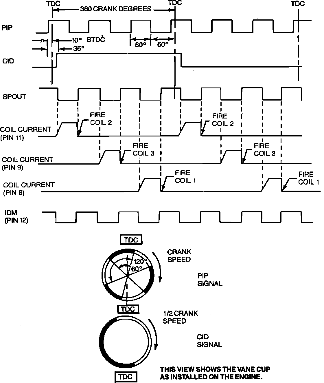 The PCM determines spark angle using the PIP signal to set base timing. Spout is sent from the processor to the ICM and serves two purposes: The leading edge fires the coil and the trailing edge controls the dwell time. This feature is called Computer Controlled Dwell (CCD).