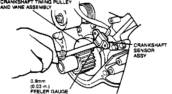 2. Set clearance between crankshaft position sensor assembly and one vane on crankshaft sprocket with a 0.030 inch (0.8 mm) feeler gauge. Tighten screws to 22-31 In-lbs. (2.5-3.5 Nm).