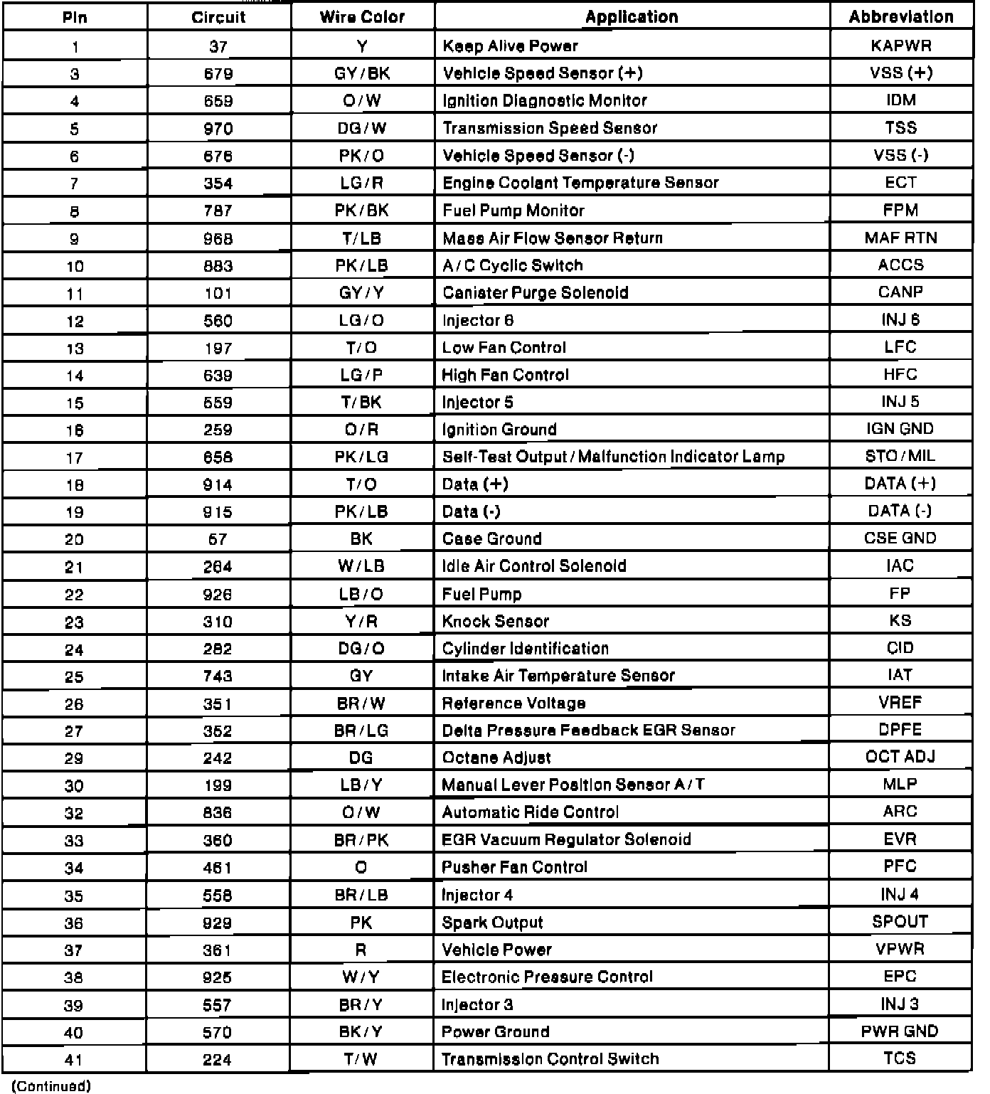 Powertrain Control Module (PCM) Connector Pin Usage: