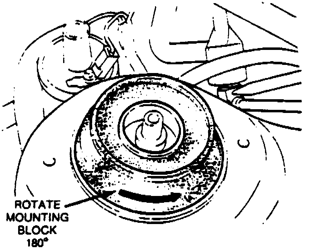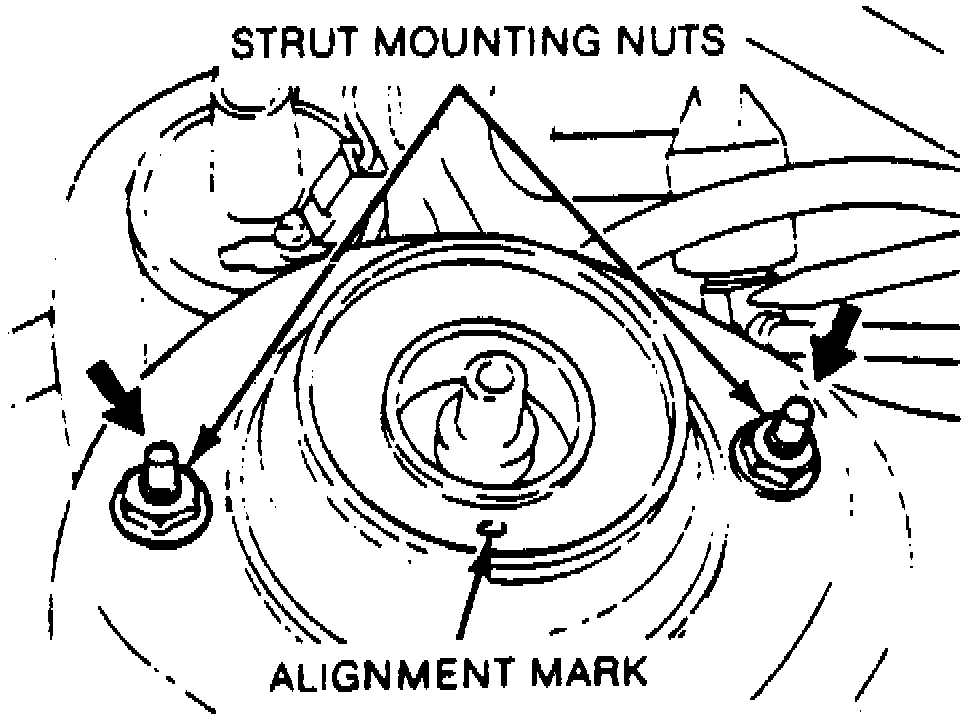 Camber angle is controlled by the position of the strut mounting block in the shock tower. The mounting block can be positioned in the tower in two ways, resulting in a camber variation of approximately 1/2°. If the camber setting has not been changed previously, the white alignment mark on the mounting block will be positioned on the outboard side of the strut assembly. Changing the position of the alignment mark 180° will increase camber angle approximately 1/2°. If the alignment mark is already positioned inboard of the strut, changing the mounting block position can only result in camber being reduced by approximately 1/2°. To adjust camber setting, proceed as follows: