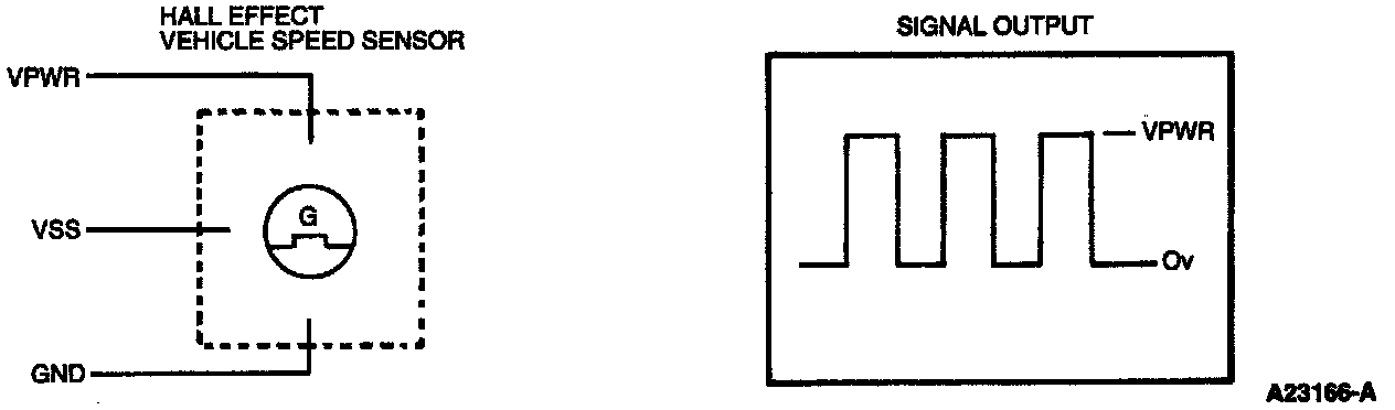 The Vehicle Speed Sensor (VSS) is a hall effect sensor that generates a waveform with a frequency that is proportional to vehicle speed. When the vehicle is moving slowly, the sensor produces a low frequency signal. As the vehicle speed increases, the sensor produces a higher frequency signal. The Powertrain Control Module (PCM) uses this signal for idle speed control and transmission/transaxle shift points.