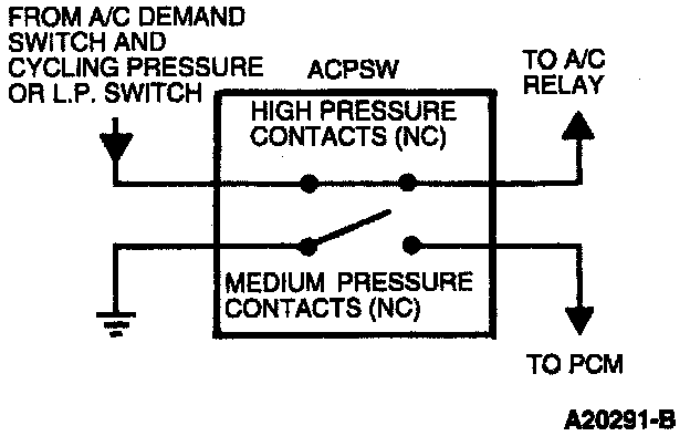 For A/C systems using R134a refrigerant: When the medium pressure contacts of the ACPSW are closed, the ACPSW input to the PCM will be grounded. This indicates that the high speed cooling fan is required.