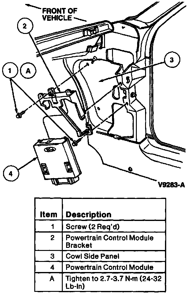 2. Remove right hand cowl side trim panel to expose Powertrain Control Module (PCM).