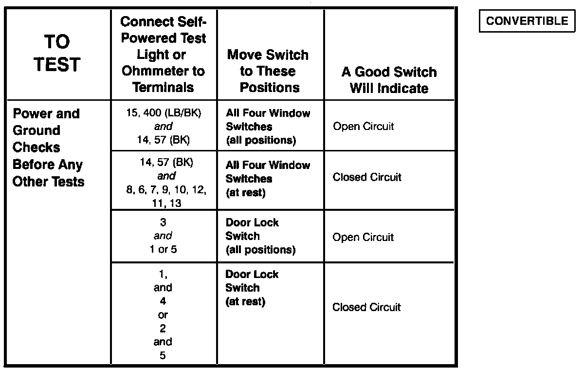 Master Window/Door Lock Control Switch (Convertible) - Component Testing Procedure (Part 1 Of 2):