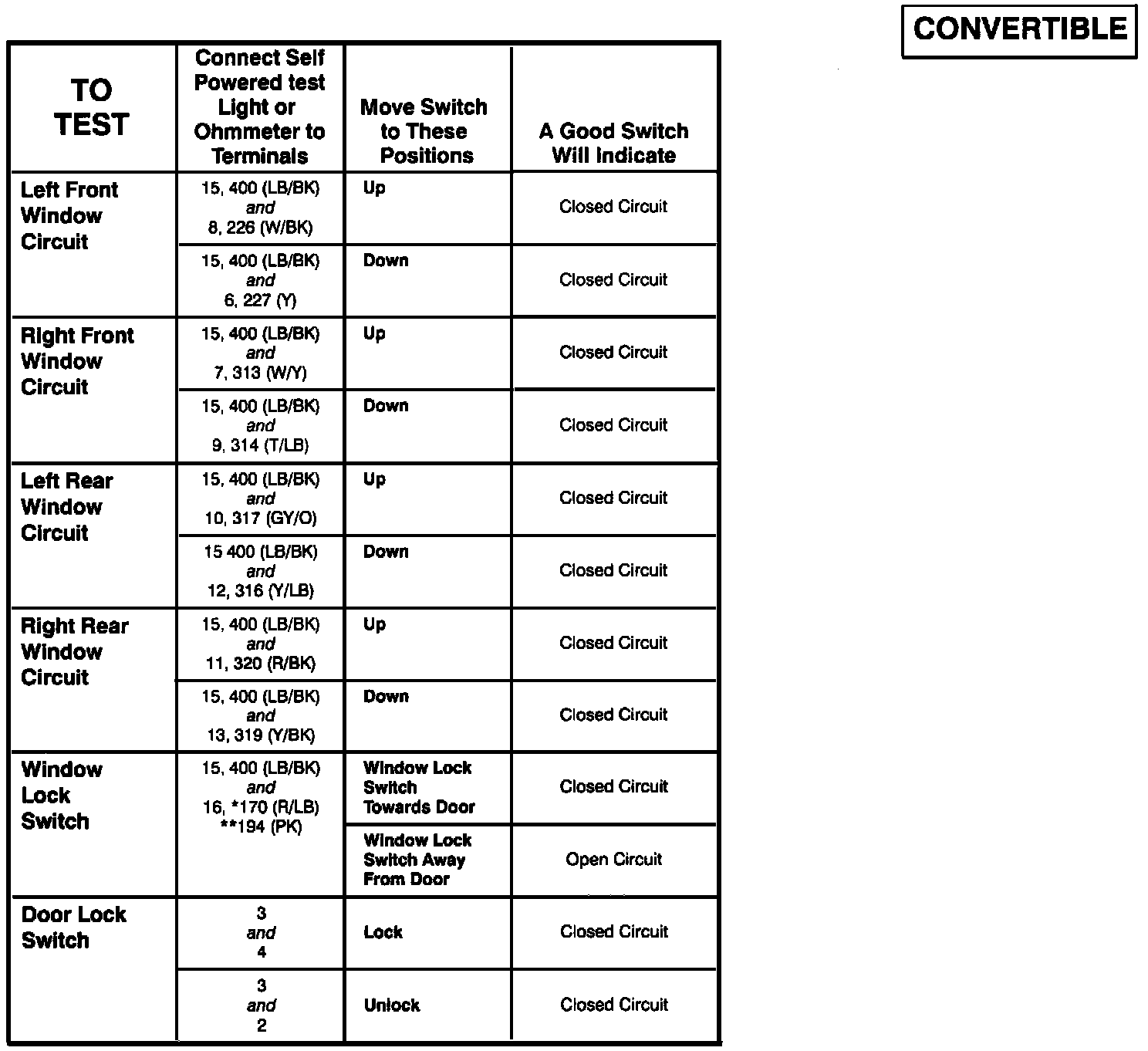 Master Window/Door Lock Control Switch (Convertible) - Component Testing Procedure (Part 2 Of 2):