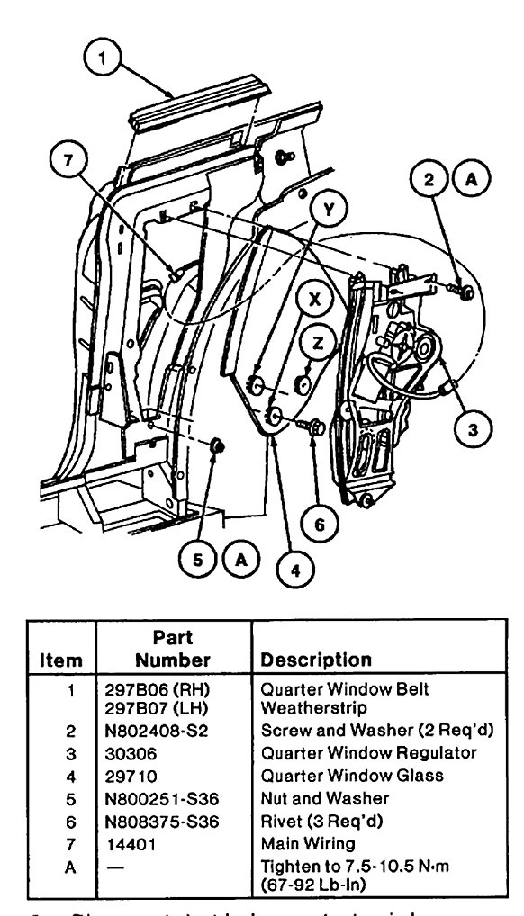 5. Remove lower screw (X) and raise quarter window glass to access upper two screws (Y and Z). Remove quarter window glass