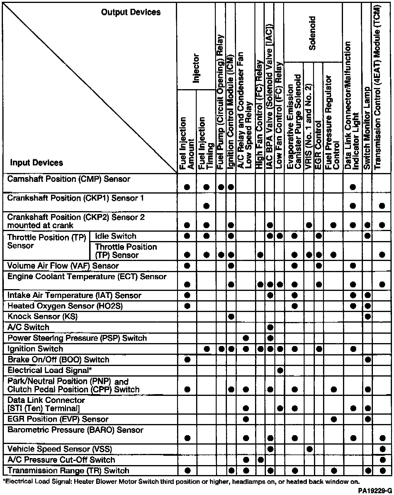 To maintain fuel economy, good driveability, reduced vehicle emissions and during normal operation, the computer monitors various engine sensors and switches. The computer interprets the data in order to control various output devices that effect air intake, amount of fuel injection, fuel injection timing, evaporative emissions, idle-up, deceleration, ignition timing and automatic transaxle lockup operation.