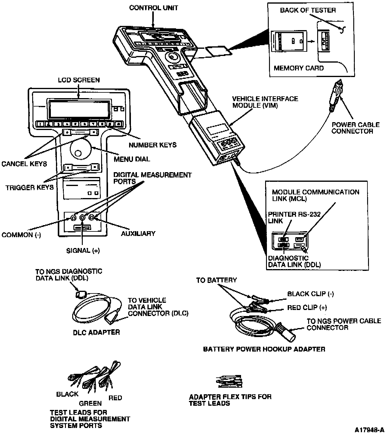 The NGS Scan Tool is a user friendly hand-held scan tool which is used to perform a variety of diagnostic testing functions. The features of the NGS Scan Tool are shown in the illustration.