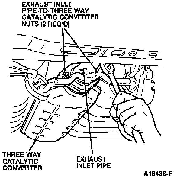 9. Remove the two exhaust inlet pipe-to-three way catalytic converter nuts.