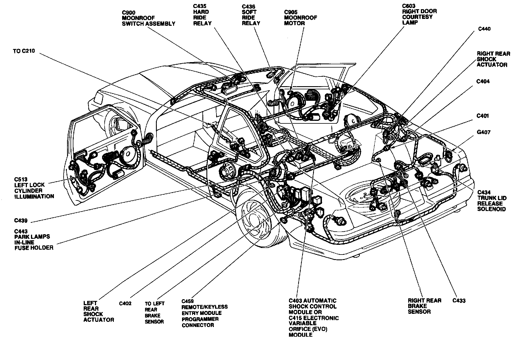 The Electronic Variable Orifice Module is located under center of the rear package tray, in the trim panel assembly.