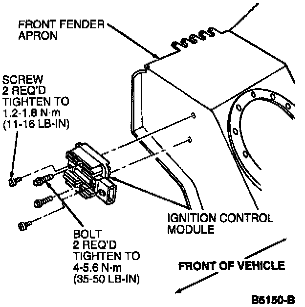 2. Remove bolts retaining ignition control module and heatsink to front fender apron.