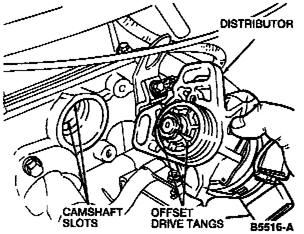 NOTE: When installing the distributor, ensure that the offset drive tangs engage with the camshaft slots. The rotor position should be the same as when removed.