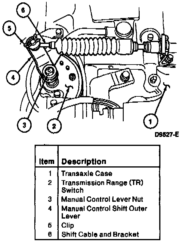2. Remove the clip securing the shift cable and bracket to the manual control shift outer lever.