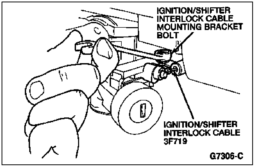 6. Position the ignition/shifter interlock cable mounting bracket and install the bolt. Tighten the ignition/shifter interlock cable mounting bracket bolt to 4-6 Nm (35-53 lb-in).
