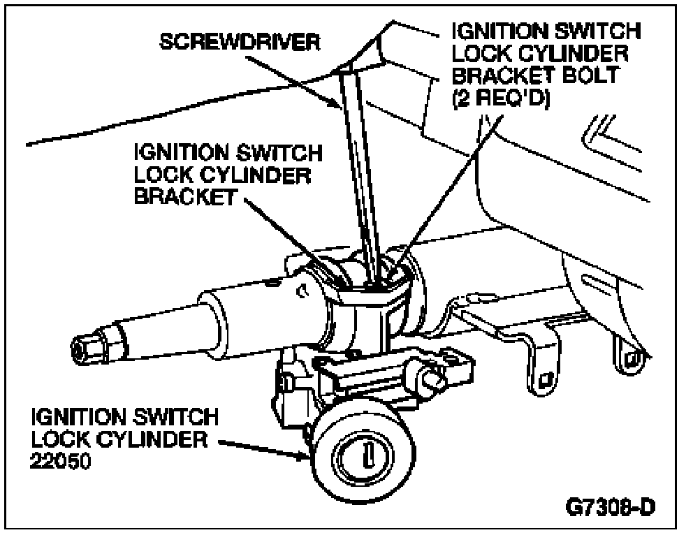 7. Remove the two ignition switch lock cylinder bracket bolts with a screwdriver and discard the bolts.