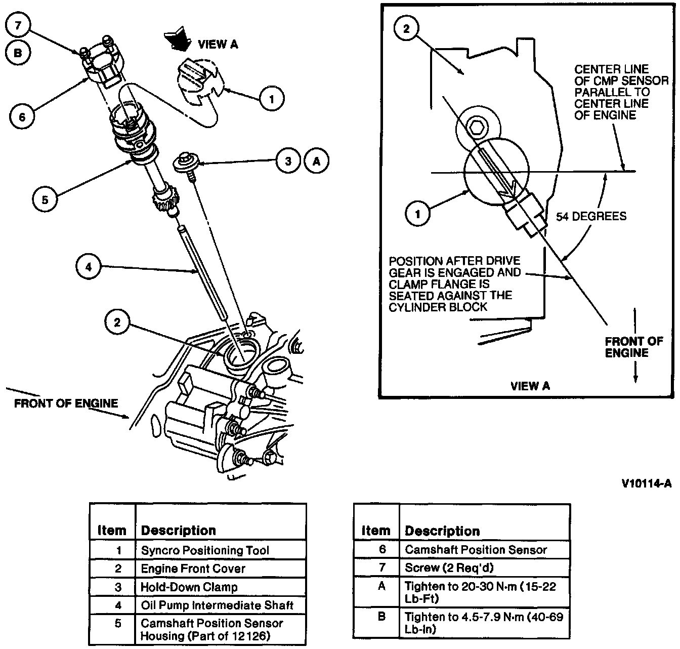 CAUTION: A special service tool Syncro Positioning Tool T96T-12200-A must be obtained prior to installation of the replacement Camshaft Position (CMP) sensor. Failure to follow this procedure will result in improper camshaft position sensor alignment. This will result in the fuel system being out of time with the engine, possibly causing engine damage.