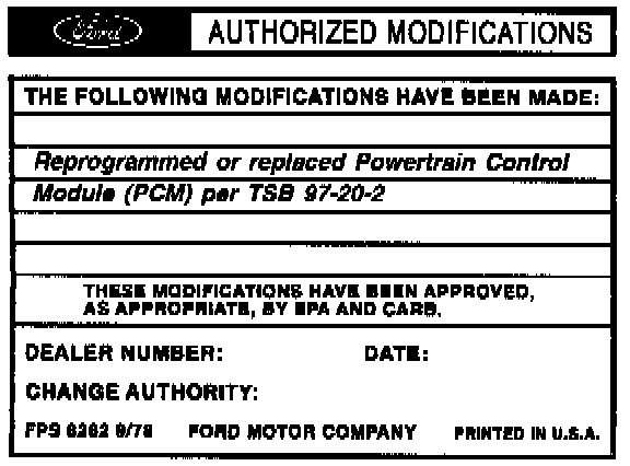 Obtain an Authorized Modification Decal (FPS 8262 - obtainable through DOES II, 25/pkg) and list the date, dealer number, and summary of modifications performed. Select a prominent place adjacent to the Vehicle Emission Control Information Decal suitable for installing the Authorized Modifications Decal. Clean the area, install the decal, and cover it with a clear plastic decal shield.