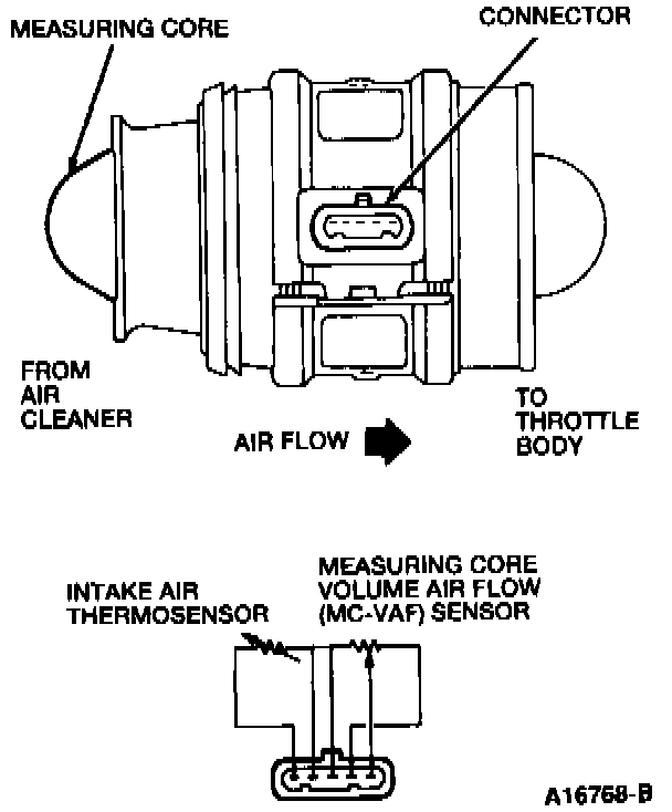 When air is passed through the Measuring Core-Volume Air Flow (MC-VAF) sensor, the measuring core moves parallel to the direction of air flow through the sensor. Core movement changes resistance through a potentiometer, providing a signal to the Powertrain Control Module (PCM) that is calculated as air flow volume. The voltage signal is used to determine fuel injection quantities.