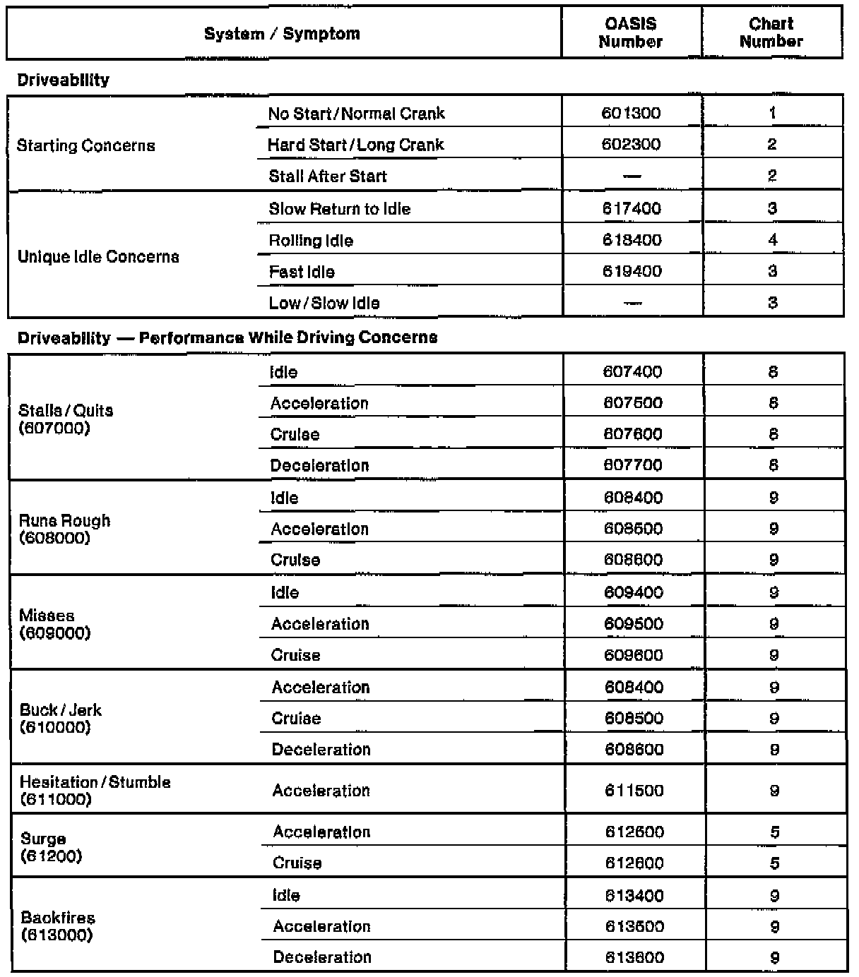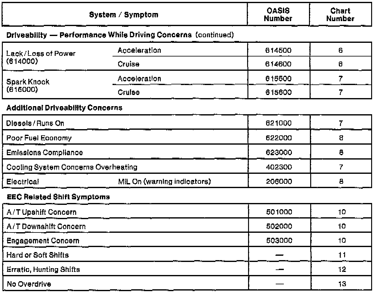 Select a symptom from the chart. For multiple symptoms, select the symptom that is most evident. Go to the chart number listed and perform the visual/mechanical and EEC checks in the suggested order.
