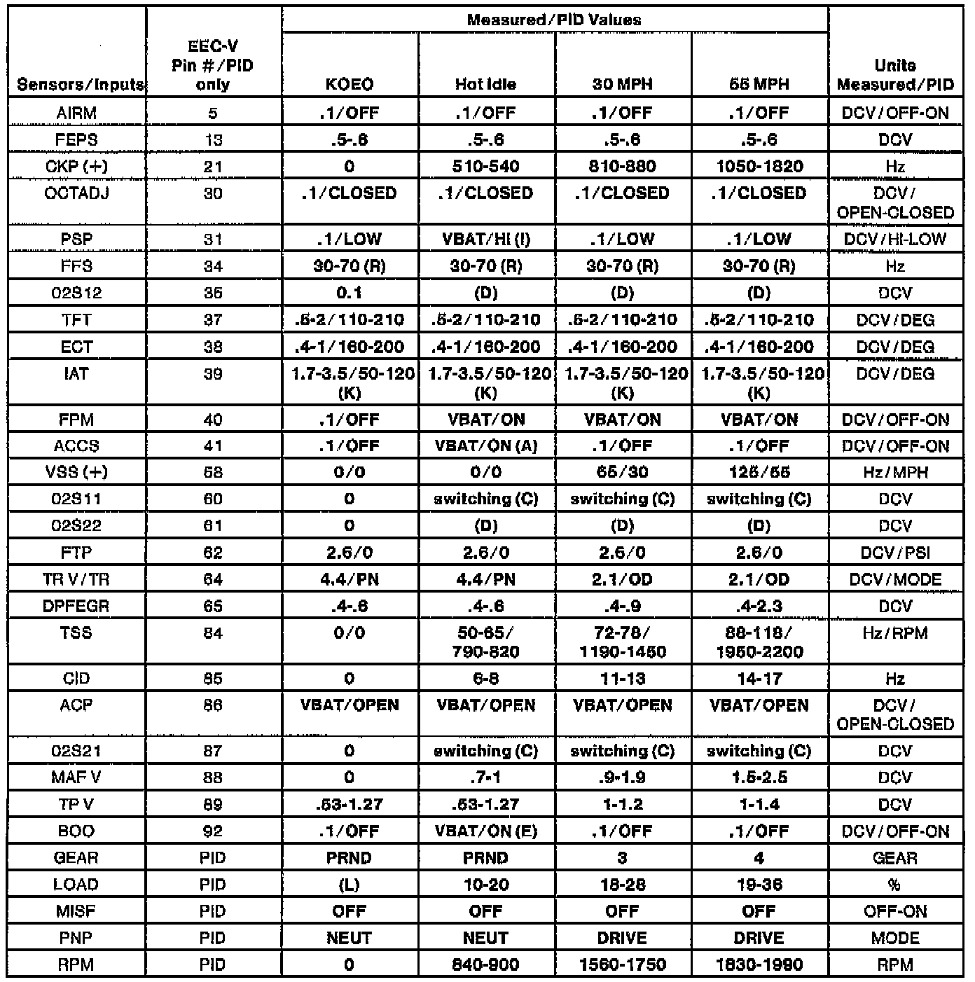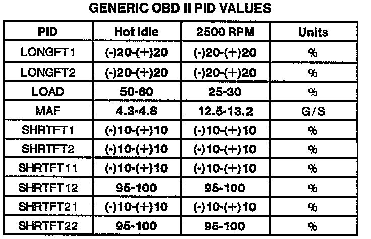 NOTE: All generic OBDII readings under no load (PARK or NEUTRAL).