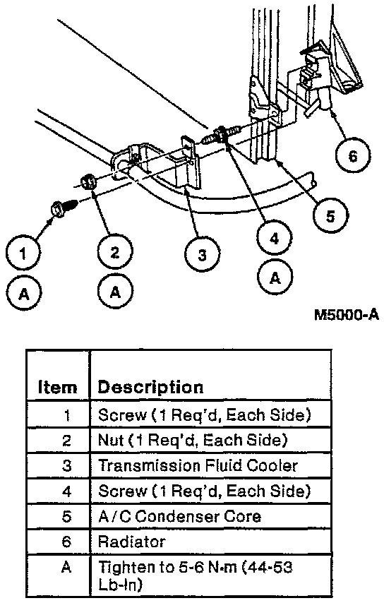 5. Remove the two nuts and the two screws retaining the transmission fluid cooler to the A/C condenser core and position the cooler aside.