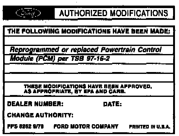 Obtain an Authorized Modification Decal (FPS 8262 - obtainable through DOES II, 251pkg) and list the date, dealer number, and summary of modifications performed. Select a prominent place adjacent to the Vehicle Emission Control Information Decal suitable for installing the Authorized Modifications Decal. Clean the area, install the decal, and cover it with a clear plastic decal shield.