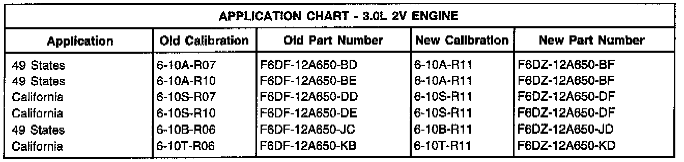 2. If no codes are present, reprogram the PCM by following the Service Bay Diagnostic System (SBDS) reprogramming tool, February 1996 CD-ROM release or later. If SBDS is not available, replace the PCM. Dealers with SBDS are required to reprogram the PCM with the appropriate calibration per the following Application Chart. Only non-SBDS dealers are permitted to replace the PCM. Refer to the following Application Chart for correct calibration or part number.
