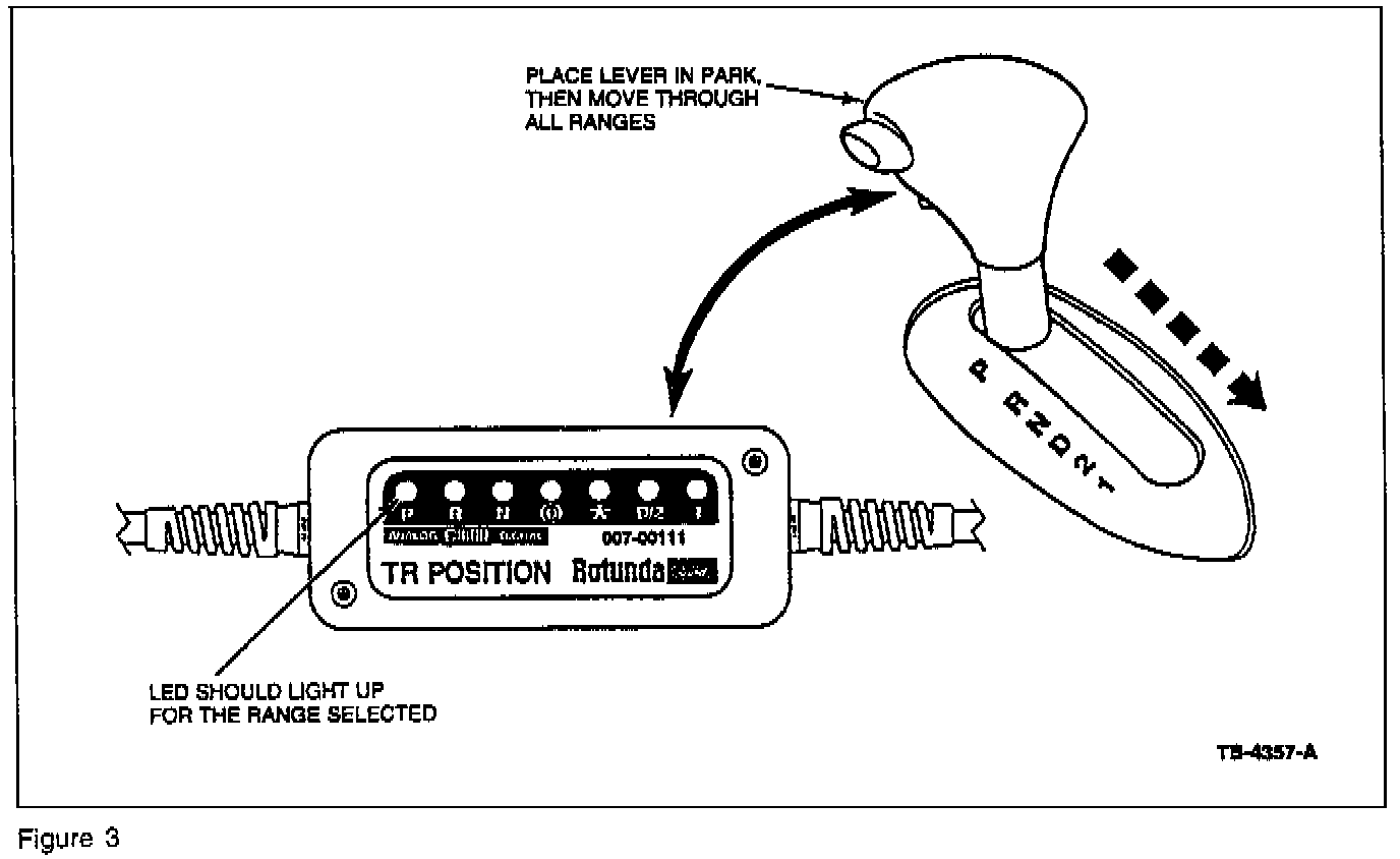 The Rotunda 1996 Transmission Range (TR) Sensor Tester Cable (007-00111) designated "TR-E" (cable indication is shown on cable end) was shipped to all dealerships in June/July. The new cable "E" is for testing on certain Taurus/Sable models equipped with an electronic instrument cluster and floor-mounted shifter. You must use this cable for correct diagnosis of the TR sensor.