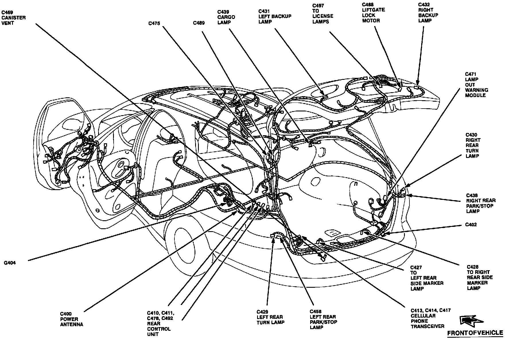 The Lamp Out Warning Module is located at the rear left side of the cargo area