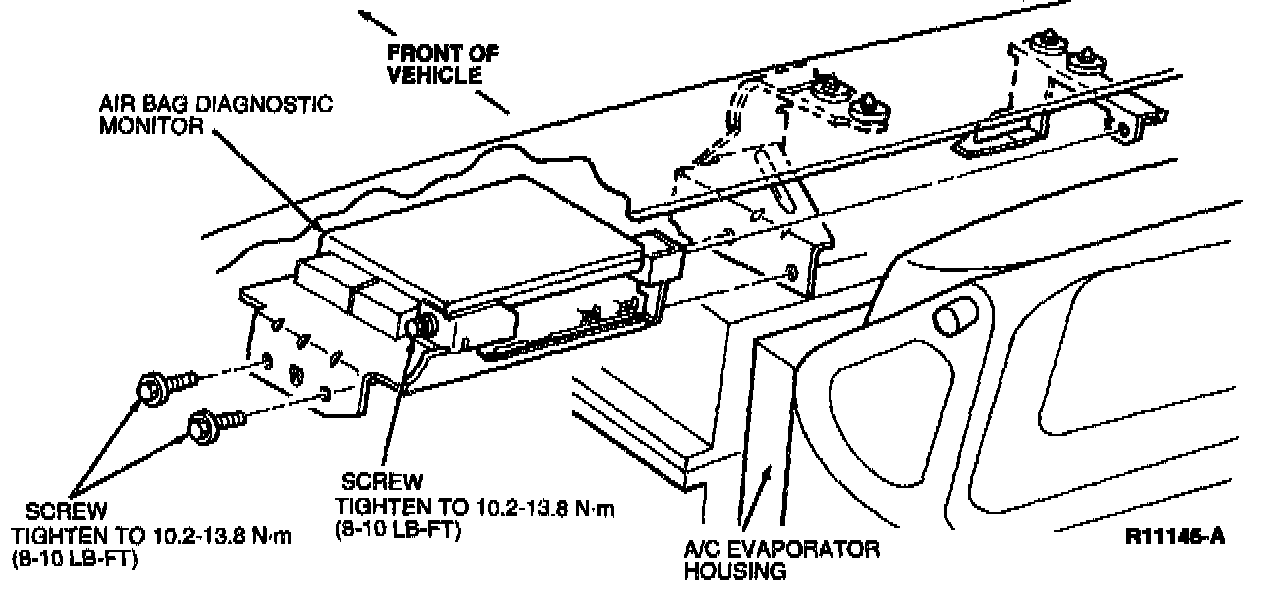 1. Install air bag diagnostic monitor on the air bag monitor bracket and tighten with three retaining screws to 10.2-13.8 Nm (8-10 lb ft).