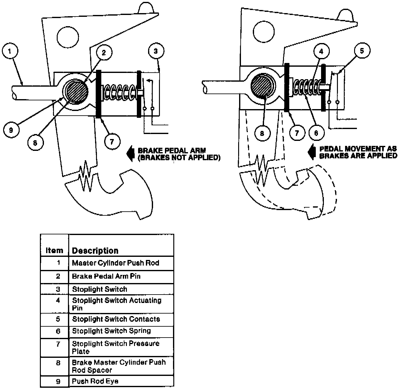 2. Remove the hairpin retainer, slide the stoplight switch, the push rod and the brake master cylinder push rod spacer and brake master cylinder push rod bushing away from the brake pedal, and remove the stoplight switch by sliding the stoplight switch up and down.