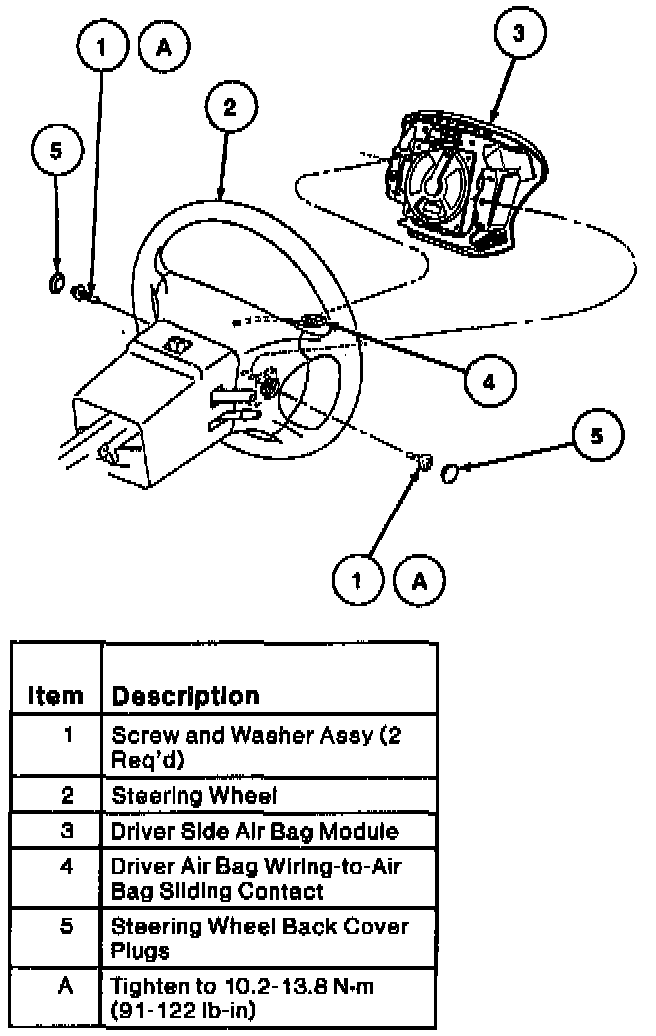 5. Install driver side air bag module on steering wheel and install two screw and washer assemblies. Tighten to 10.2-13.8 N.m (91-122 lb-in).