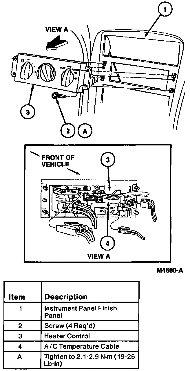 4. Place heater control into position against instrument panel. Install four retaining screws. Tighten to 2.1-2.9 N.m (19-25 Lb-In).